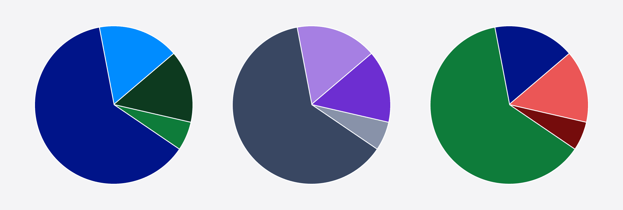 Although we’ve ensured that the recommended data visualization colors are 3:1 accessible against the background, it’s not possible to keep them 3:1 accessible against each other at the same time. So for charts that are using the categorical palette, we recommend using a divider line to separate any touching colors which also help to differentiate between categories.